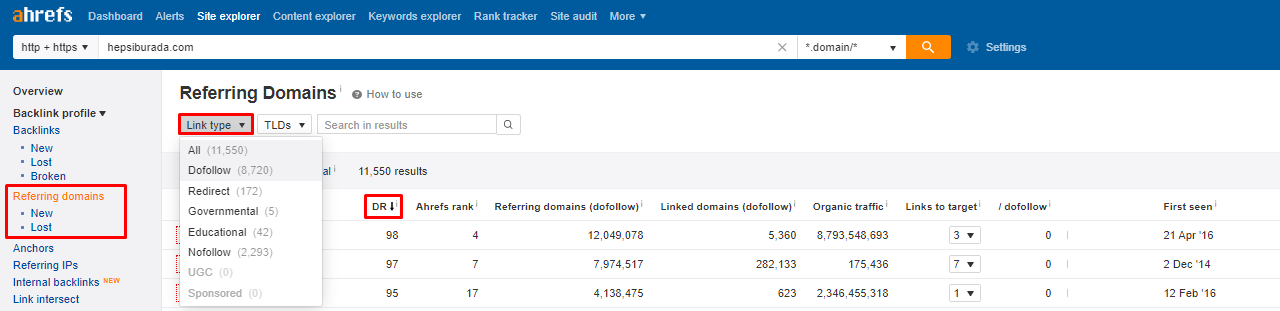 Sitenize farklı alan adlarından gelen linklerin sayısını gösterir. Bu linkleri ister DR sırasına göre isterseniz organik trafiğine göre sıralayabilirsiniz. Bu sayede sitenize gelen düşük kaliteli bağlantıları görebilirsiniz. Domainleri TLDS’e göre (.com, .net vb.) seçip filtreleyebiliyorsunuz.
